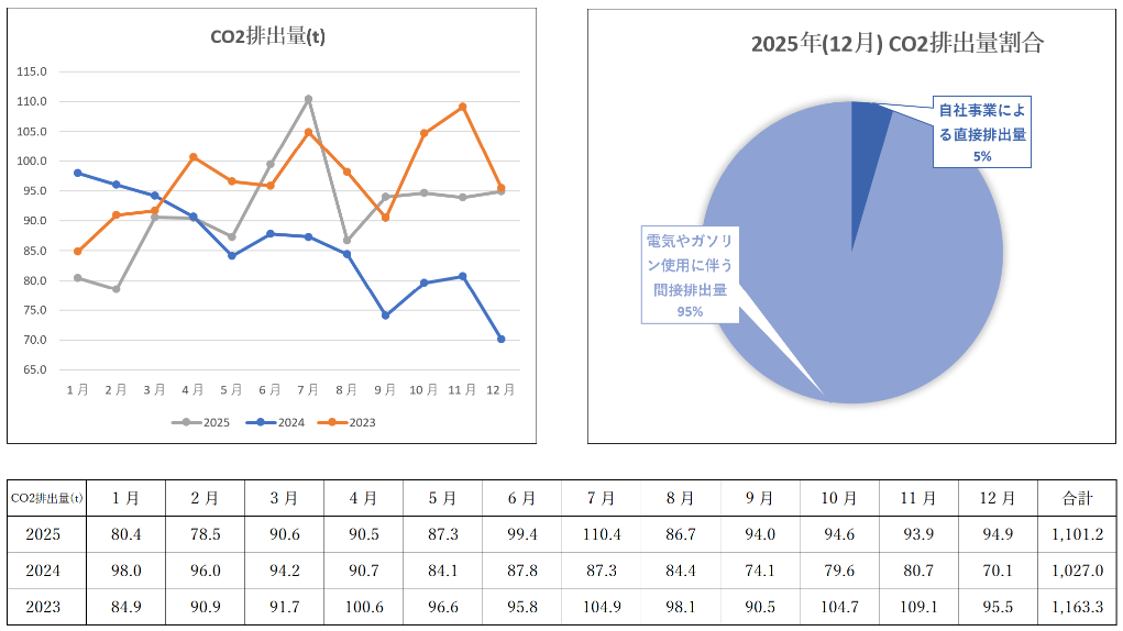 12月のCO2排出量は前年比+35%、電気使用量は+37%、ガソリン使用量が+5%の全項目で目標未達の結果となりました。